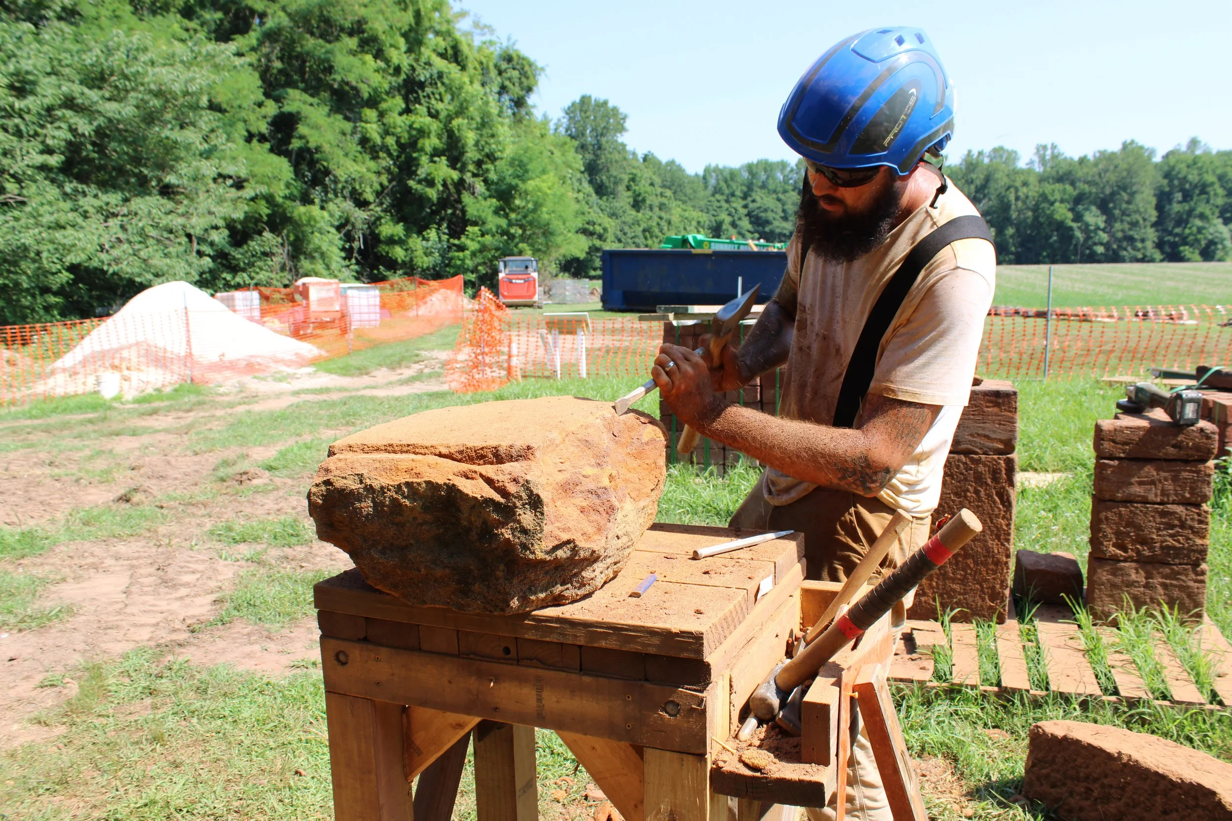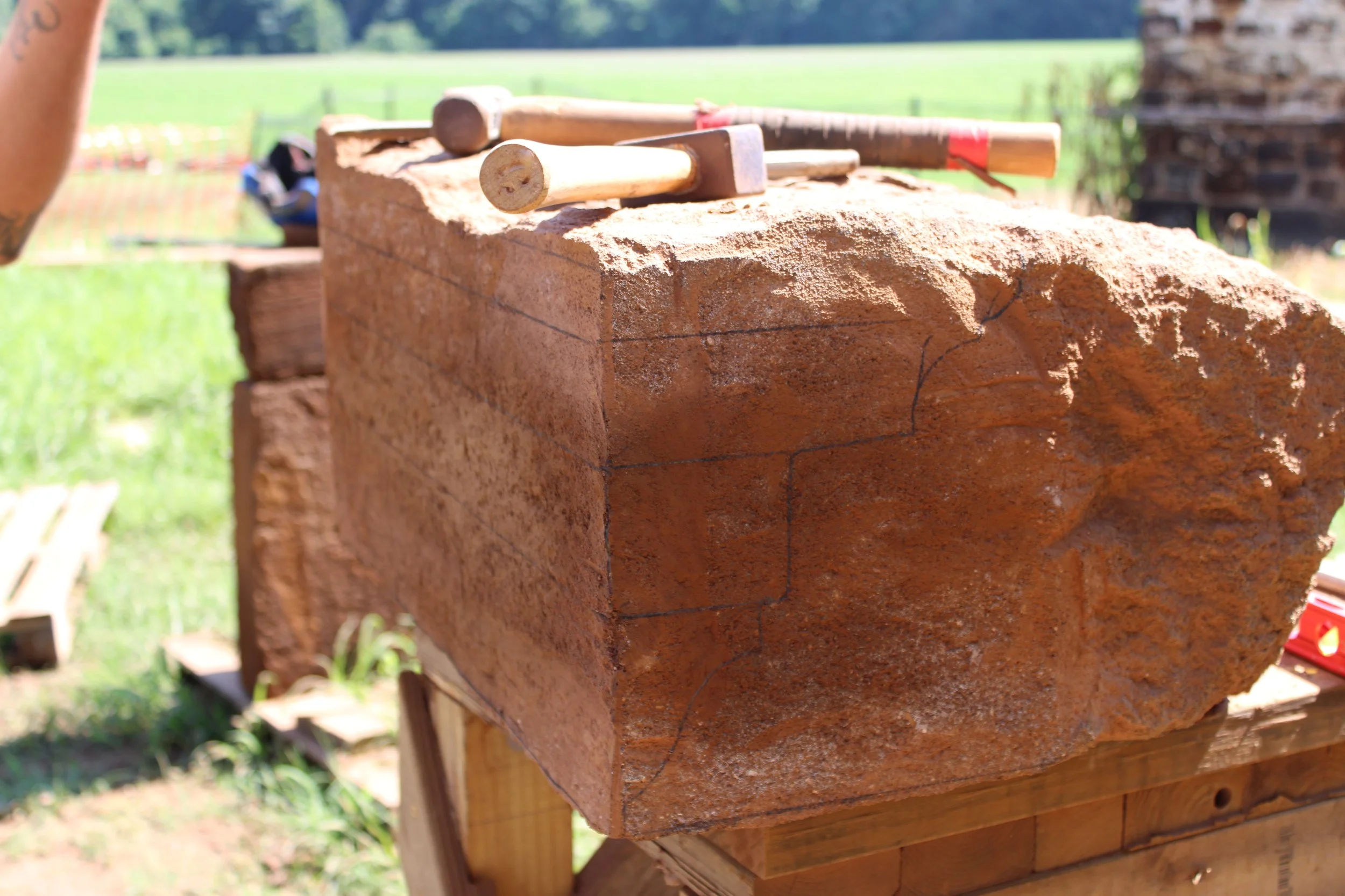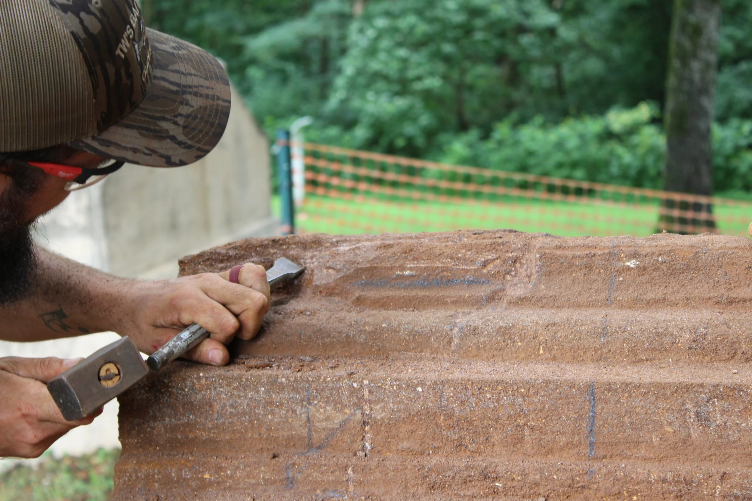 First, a stone is selected, and is “dressed” into a mostly level stone of proper proportions. To do this, the stone is “squared up” by hand chiseling an even flat side and chiseling guidelines for the areas that will be kept. Then a circular saw is used to cut away the excess from the chiseled markings. This process is completed on other sides of the stone if necessary. In the images below, Hunter Shackelford prepares a stone to be cut to size by making indentations with a chisel, after having created a flat side on the top.