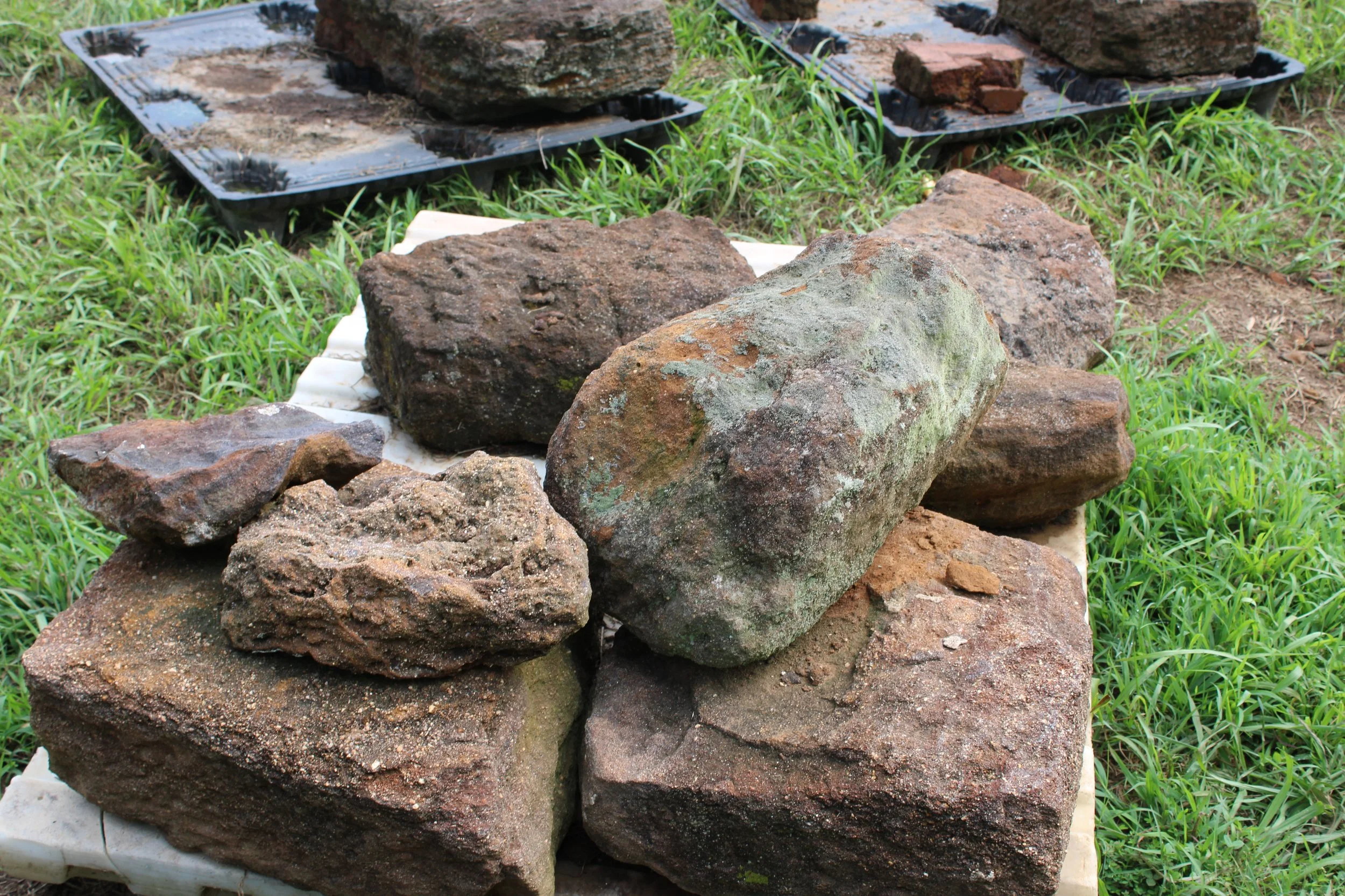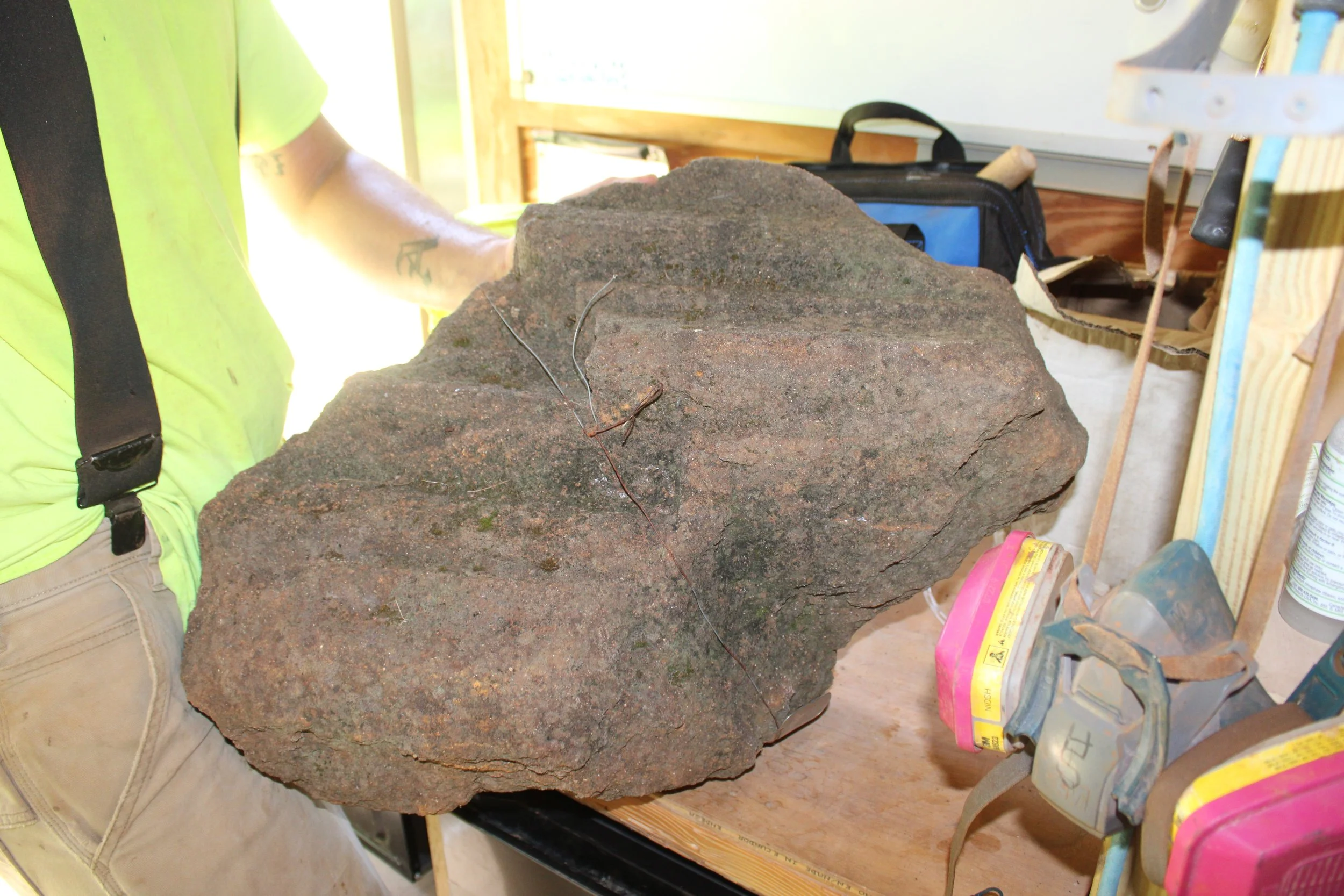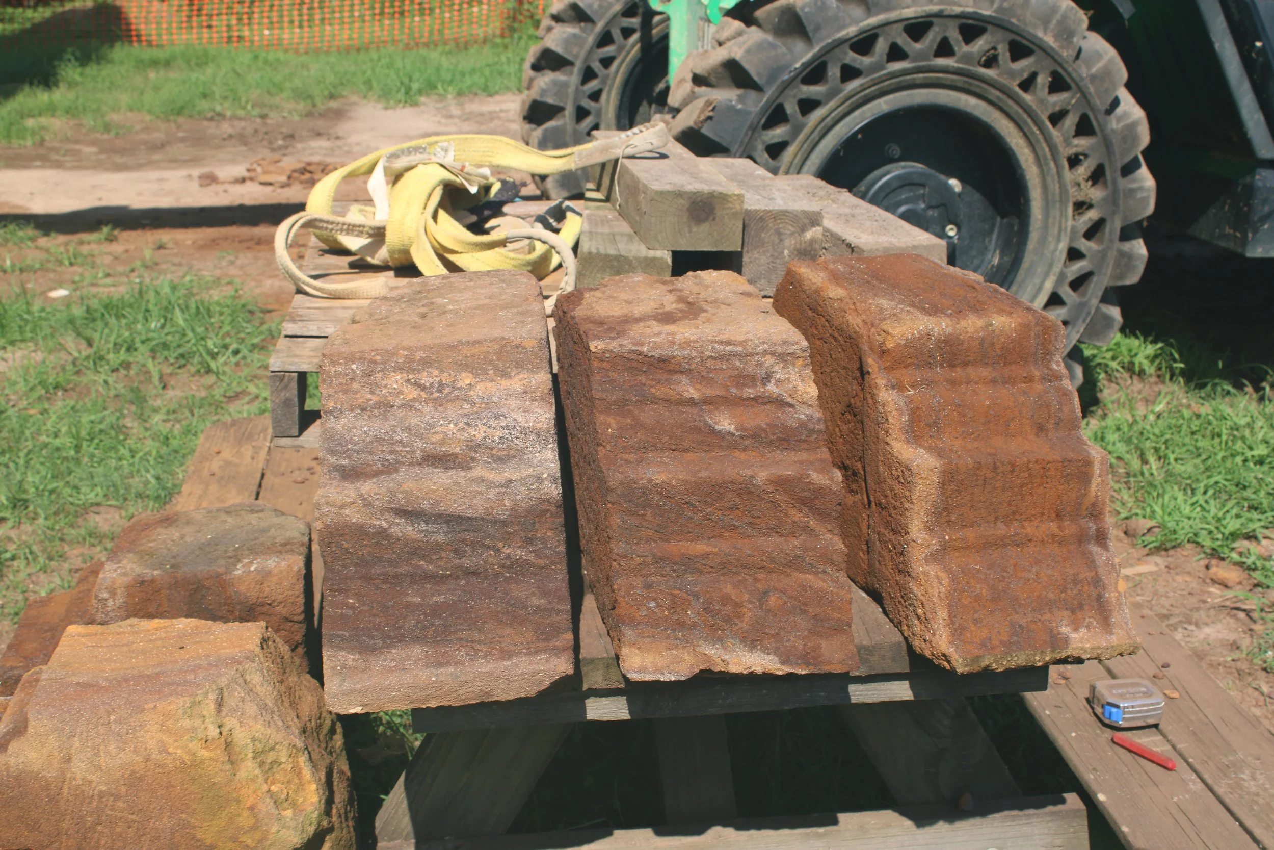First, a stone is selected, and is “dressed” into a mostly level stone of proper proportions. To do this, the stone is “squared up” by hand chiseling an even flat side and chiseling guidelines for the areas that will be kept. Then a circular saw is used to cut away the excess from the chiseled markings. This process is completed on other sides of the stone if necessary. In the images below, Hunter Shackelford prepares a stone to be cut to size by making indentations with a chisel, after having created a flat side on the top.
