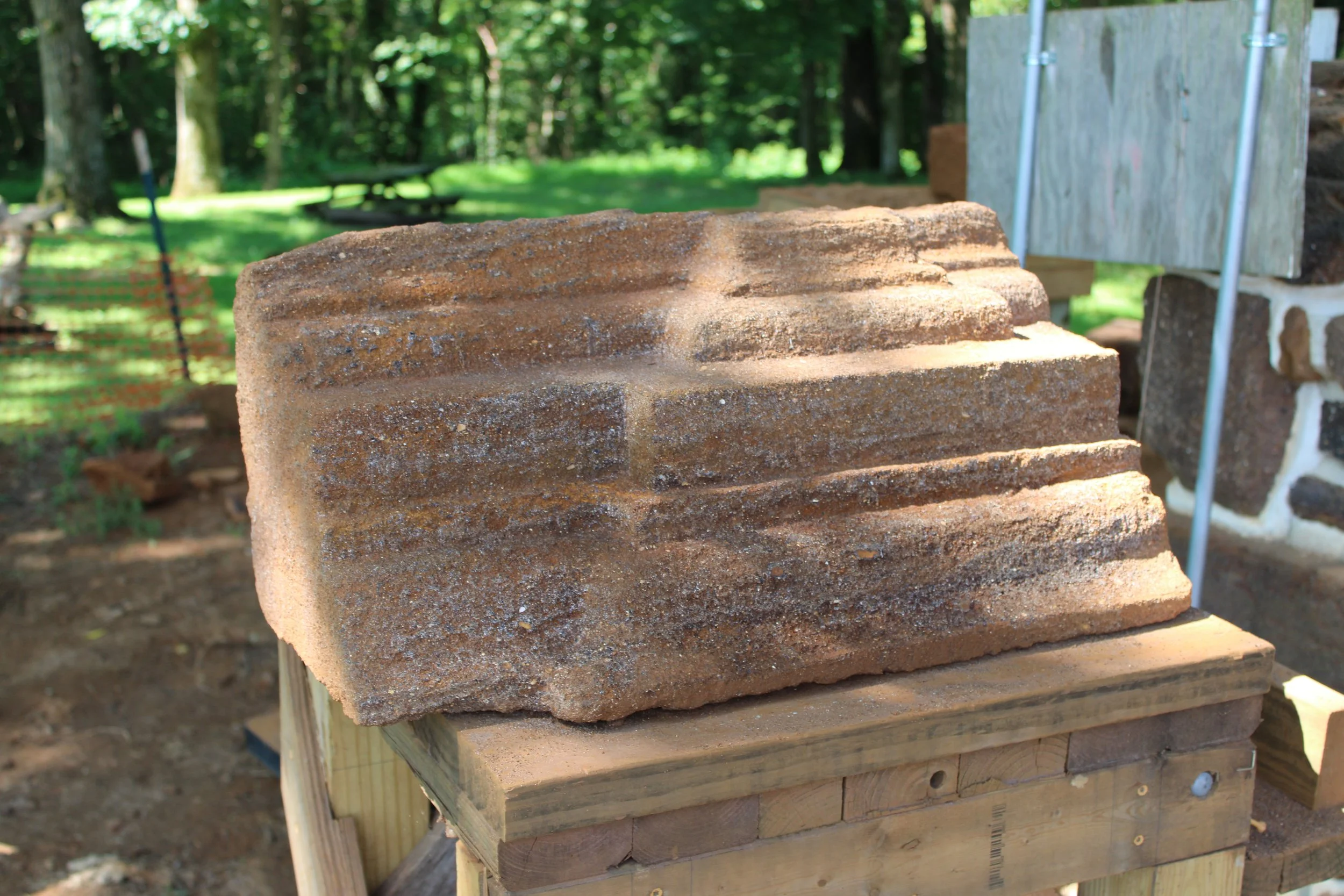 One of the most captivating projects undertaken on-site recently is the re-fabrication of Menokin’s distinctive decorative stonework. Using both architectural documentation and surviving references, Dominion’s expert stone masons are meticulously restoring the detailed cornice work which crowns Menokin’s front entrance, placing a major piece in the evolving puzzle that is the Glass House Project.