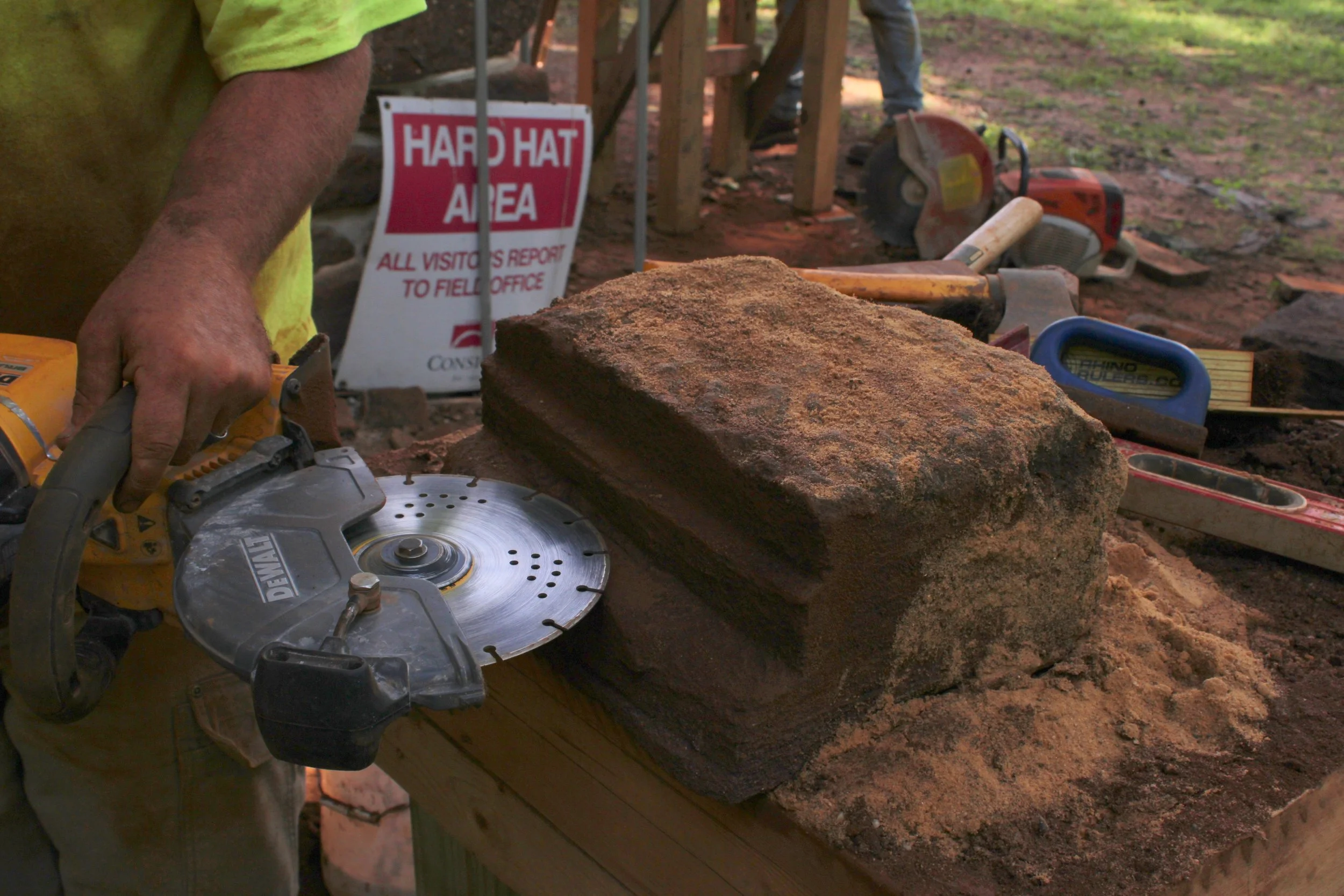 With the markings in place, the largest cuts to the stone are made with a circular saw, a tool that would not have been available to the stone masons who built Menokin, but helps to expedite the process of preliminary mass reduction.