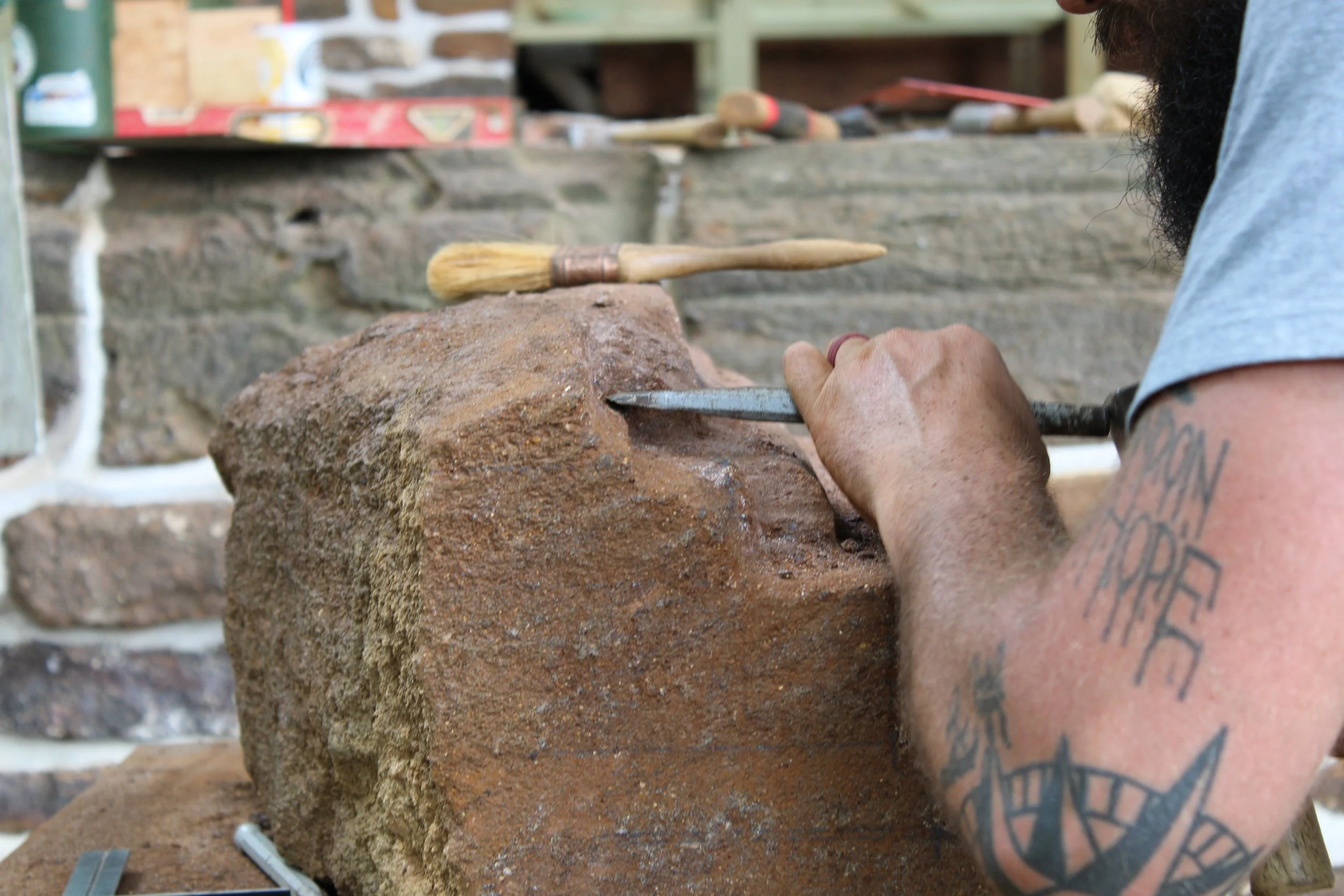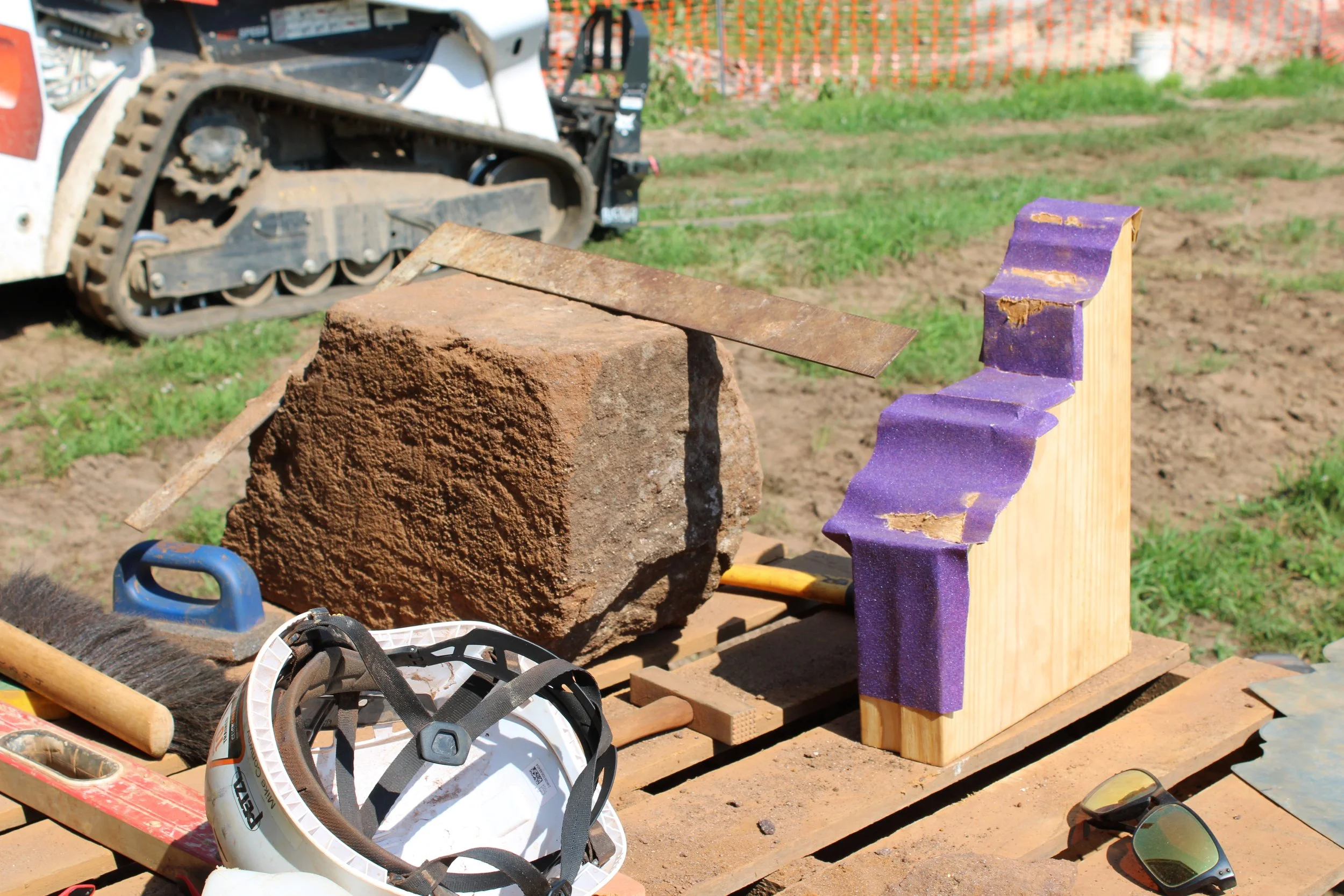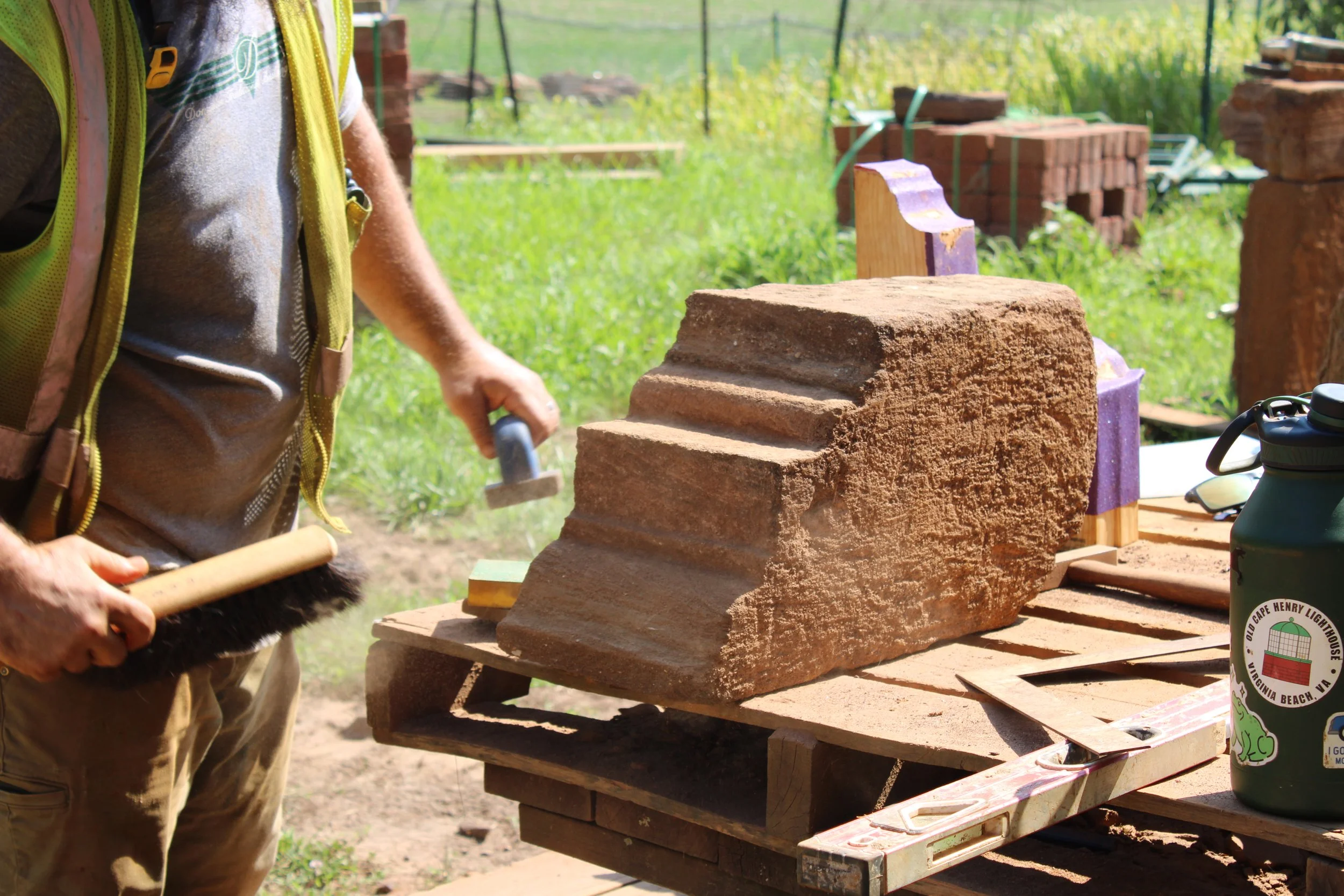 After the stone has been cut to match the general outlines of specification, it is refined to match the originals through light chisel work, stone rubbing, and sanding. In the image below, Hunter chisels the cornice piece to match his guide line.
