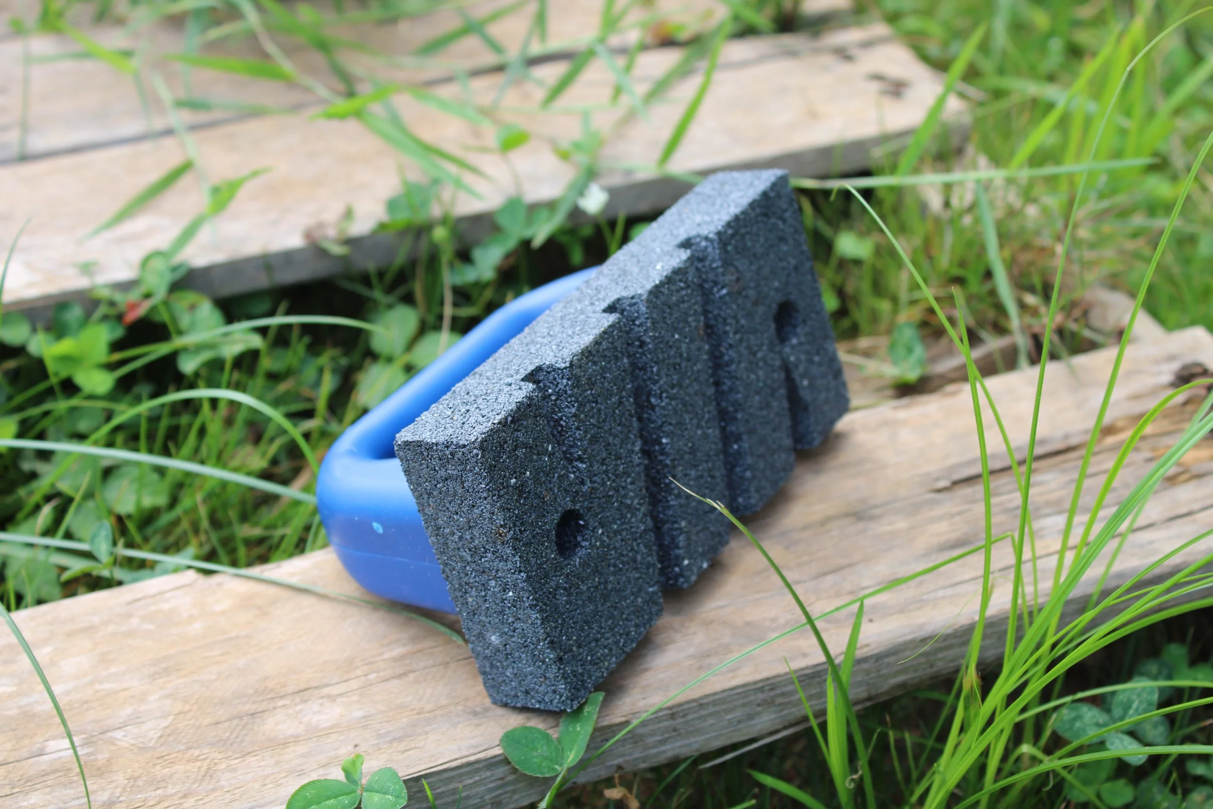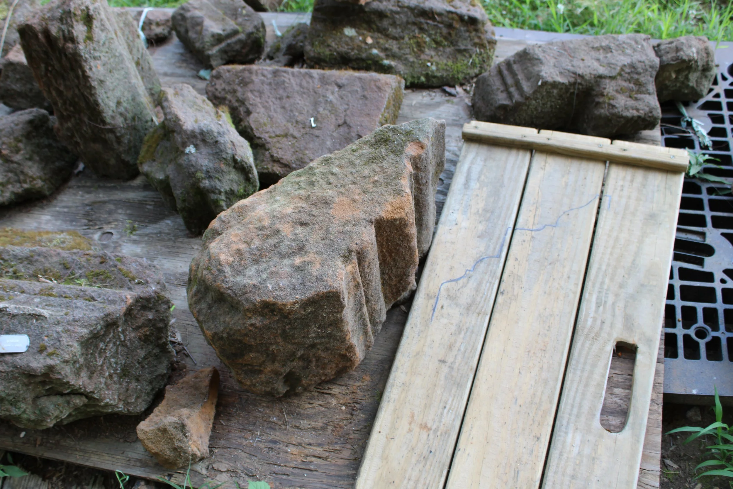 Following any chisel work, a stone rubbing tool is used to smooth the surface of the stone, and refine rounded details. After the stone has been rubbed to match the desired form, finer adjustments are made by attaching sandpaper to a jig and rubbing back and forth.