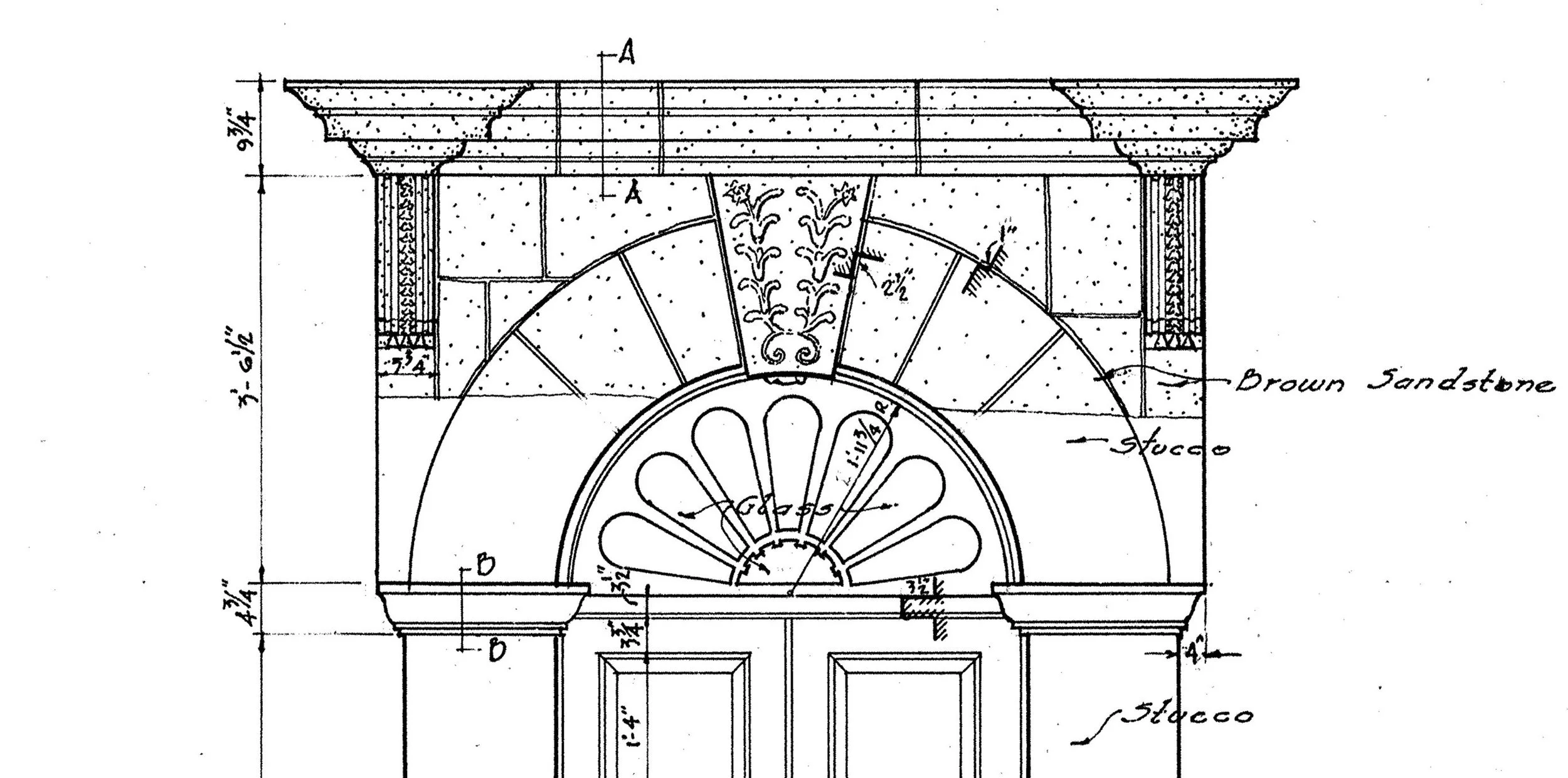 This image is taken from the HABS drawing of the front entrance, showing a detailed dissection of its architectural elements. Our focus here is on the above-door cornice, which sits above the door arch and keystone, and is labeled “A” in the diagram.