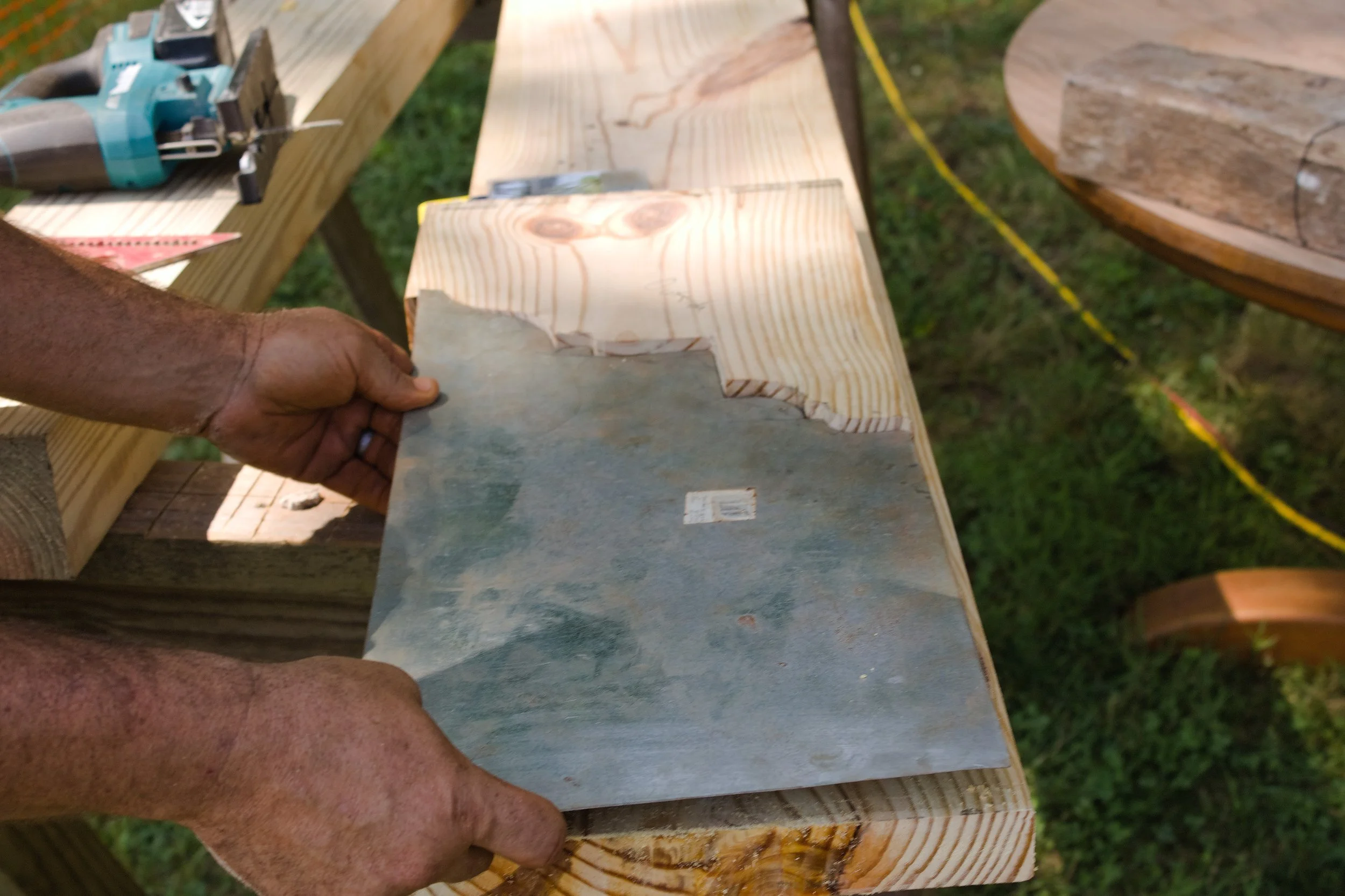 In the image above, the template is the metal piece, which has been used to create the corresponding jig. It is helpful to think of the wooden jig as being a recreation of the original stonework’s silhouette, and the template being what would be left by an impression taken of the stone. The jig is often used for “fine tuning,” not initial marking.