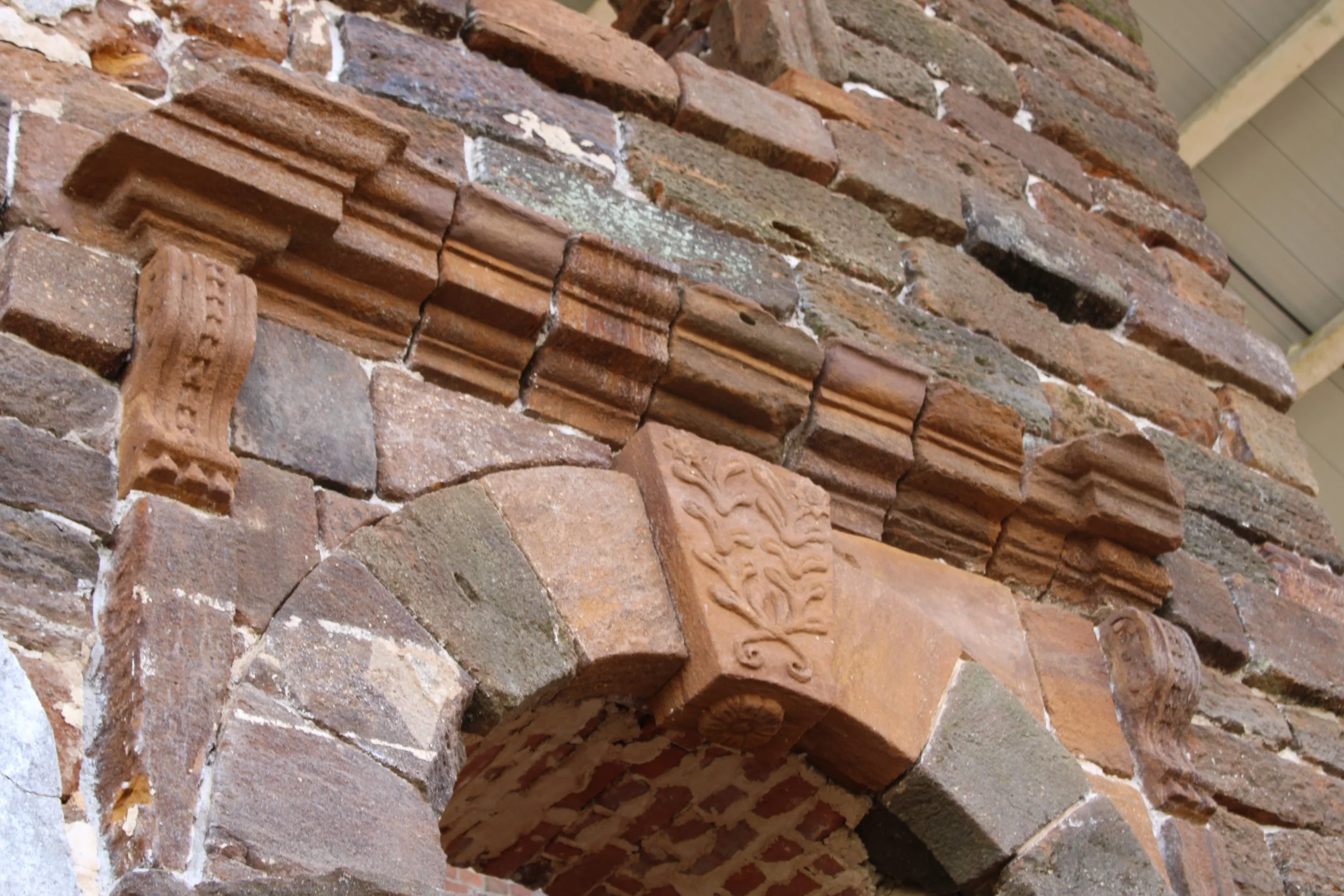 Rebuilding the North wall also meant rebuilding the stone archway and incorporating the front door keystone with its memorable tobacco flower and leaf design. The keystone that was installed in the ruin is a replica that was made on site during the summer of 2025 by stonemason Hunter Shackleford. The original keystone was deemed too fragile to reintroduce back into the ruin, but is now on permanent display at our Visitor Center for everyone to see up close.