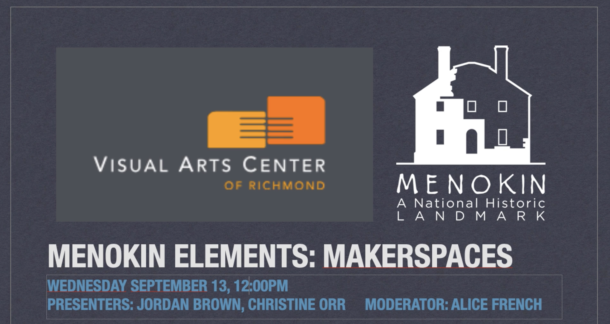 If you missed our latest webinar in the Menokin Elements Makerspaces series, the recorded version is now available. This episode features Executive Director Jordan Brown and artist Christine Orr from the renown Visual Arts Center in Richmond, VA.