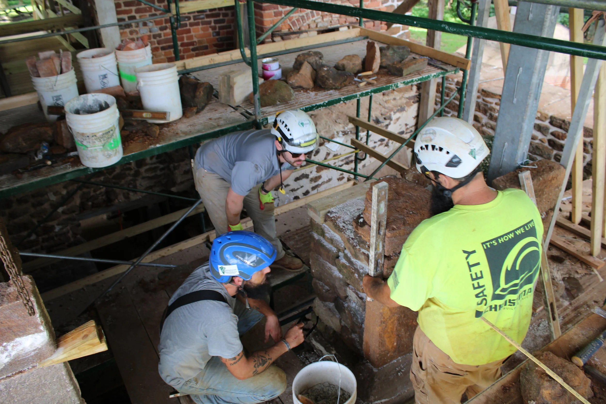 Work on the ruin also began in the summer, specifically on the North wall. Hard hat tours were officially on! Some guests during this time may have also been given a tour by one of our summer interns from William & Mary: Keaton, Lorenzo, and Olivia. You can see a photo archive of work being done on the ruin here.