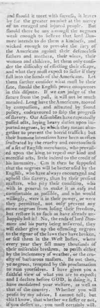 “But should there be any amongst the negroes weak enough to believe that lord Dunmore intends to do them a kindness, and wicked enough to provoke the fury of the Americans against their defenceless father and mothers, their wives, their women and children, let them only consider the difficulty of effecting their escape, and what they must expect to suffer if they fall into the hands of the Americans.”