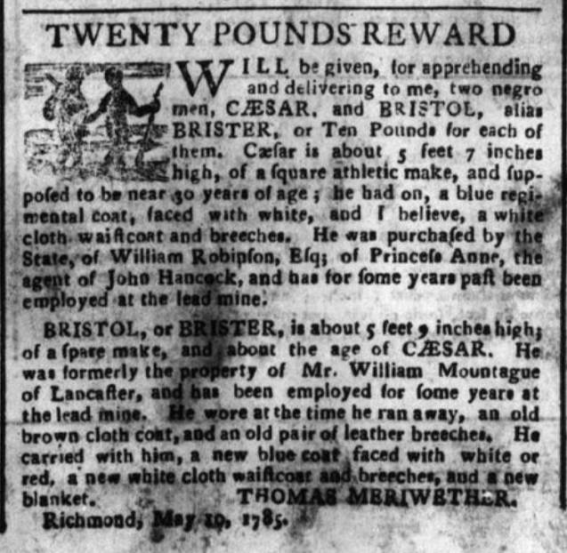 Bristol was forced to work at Chiswell’s lead mines, located in present-day Wythe County, mining the lead used to create bullets for the American cause. Being sent to the mines served as punishment to any enslaved person who sought freedom with the British. Bristol’s last known whereabouts after the war are from the Virginia Gazette newspaper rewarding twenty pounds for his and another enslaved man’s, Caesar, recapture in 1785. It’s currently unknown whether they were ever recaptured.